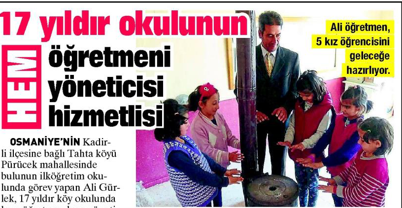 22 yıl önce mesleğe başlayan öğretmen Ali Gürlek, Yayla köyü ilkokulunda, yöneticilik ve hizmetli işlerini de kendi görüyor. Birleştirilmiş sınıfta 2.3. ve 4. sınıftaki 5 öğrenAli öğretmen, 5 kız öğrencisini geleceğe hazırlıyor. i ciyi okutan