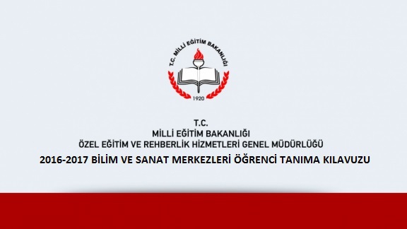 Milli Eğitim Bakanlığı Özel Eğitim ve Rehberlik Hizmetleri Genel Müdürlüğü tarafından yayınlanan 2016-2017 Bilim ve Sanat Merkezleri Öğrenci Tanılama Kılavuzu´nu indirmek için tıklayınız.