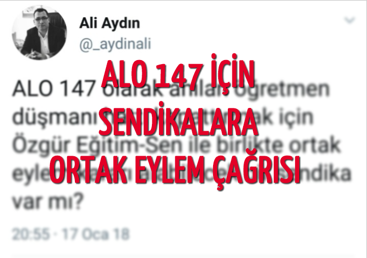 Aydın Twitter hesabından yaptığı paylaşımda, ‘Alo 147 olarak anılan öğretmen düşmanı hattı kapattırmak için Özgür Eğitim-Sen ile birlikte ortak eylem kararı alabilecek bir sendika var mı?’, diye sordu.