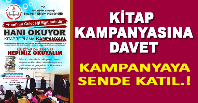 Diyarbakır Hani İlçe Kaymakamı Şaban Arda Yazıcı ve Hani İlçe Milli Eğitim Müdürü Zeki Kaya’nın başlattığı ”Hani Okuyor” isimli kitap kampanyasının, yurt genelinde ilgi görmesi bekleniyor.