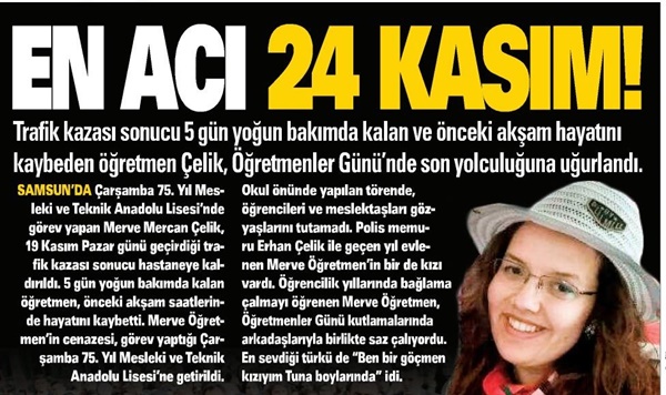 SAMSUN’DA Çarşamba 75. Yıl Mesleki ve Teknik Anadolu Lisesi’nde görev yapan Men/e Mercan Çelik, 19 Kasım Pazar günü geçirdiği trafik kazası sonucu hastaneye kaldırıldı.