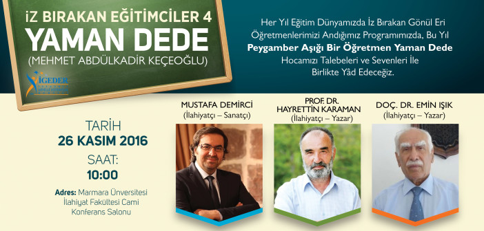 İstanbul Gönüllü Eğitimciler Derneği (İGEDER) önceki yıllarda Nurettin Topçu, Mahir İZ ve Mahmut BAYRAM hocaları anarak gerçekleştirdiği “İz Bırakan Eğitimciler” etkinliğine  bu sene 1887 tarihinde Talas’ta, Ortodoks bir ailenin çocuğu olarak dünyaya gelen YAMAN DEDE ile devam ediyor.  26 Kasım 2016 tarihinde Marmara Üniversitesi İlahiyat Fakültesi konferans salonunda saat 10.00’da yapılacak anma programına öğrencileri Prof. Dr. Hayreddin KARAMAN, Doç. Dr. Emin IŞIK ile akademisyen, yazar ve sanatçı Mustafa DEMİRCİ katılacaktır.