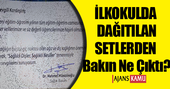 Okullarda dağıtışlan setlerden Sağlık Bakanı Değişmesine rağmen Yeni Sağlık Bakanı Recep AKDAĞ imzalı not yerine Eski sağlık bakanı Mehmet MÜEZZİNOĞLU imzalı notlar çıktı.