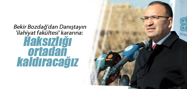 Başbakan Yardımcısı ve Hükümet Sözcüsü Bozdağ, Danıştayın ‘ilahiyat fakültesi’ kararına ilişkin, ‘İlahiyat mezunlarının öğretmenlik haklarının ellerinden alınmasına izin vermeyiz. Bu konudaki değişiklik neyse bunu yapacağız. Başbakanımızla, Cumhurbaşkanımızla ve Milli Eğitim Bakanımızla bu konu istişare edilmiştir. Önümüzdeki günlerde bununla ilgili bir yasal düzenleme yapacağız ve bu haksızlığı ortadan kaldıracağız.’dedi.