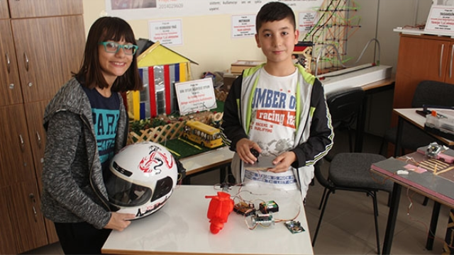 BİLSEM öğrencilerinden 13 yaşındaki Efe Gündeğer ve Dilek Öykü Ahraz, motosiklet kazalarında can kaybını engellemek için kask takılmadığında uyarı veren ve motosikletin çalışmasını engelleyen düzenek geliştirdi.
