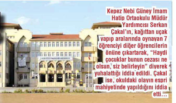 Kepez Nebi Güney İmam Hatip Ortaokulu Müdür ıYardımcısı Serkan Çakal’ın, kağıttan uçak vapıp aralarında oynavan 7 öğrenciyi diğer öğrencilerin önüne çıkartarak, ‘Haydi çocuklar bunun cezası ne olsun,’siz belirleyin’ diverek f yuhalattığı iddia edildi. Çakal’ın ‘ ise, okuldaki olayın espri i mahiyetinde yapıldığını iddia etti.