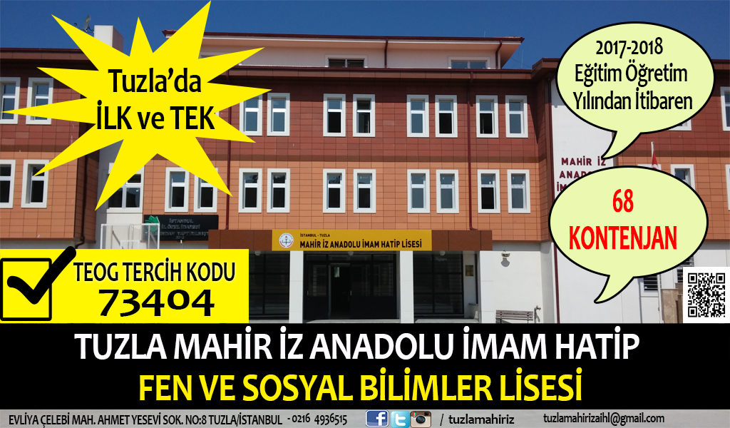 Tuzla Mahir İz Anadolu İmam Hatip Lisesi 2017-2018 Eğitim Öğretim Yılından itibaren Fen Bilimleri ve Sosyal Bilimler Anadolu İmam Hatip Lisesi Kapsamına Alındı.