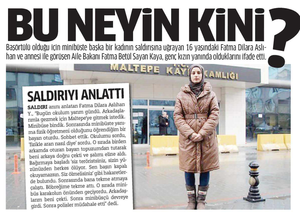 Pendik-Kadıköy hattında sefer yapan bir minibüste yaşandı. Arkadaşları ile birlikte gezmek için Maltepe’ye giden lise öğrencisi Fatma Dilara Aslıhan Y., A.A.K. isimli kadının saldırısına uğradı. Bir anda genç kızın başörtüsüne asılan kadın, ‘Siz teröristsiniz, sizin yüzünüzden herkes ölüyor. Sen başın kapalı okuyamazsın’ diyerek hakaretlerde bulundu. Genç kıza tekme de atan saldırgan, ardından kızın başörtüsünü çıkardı.