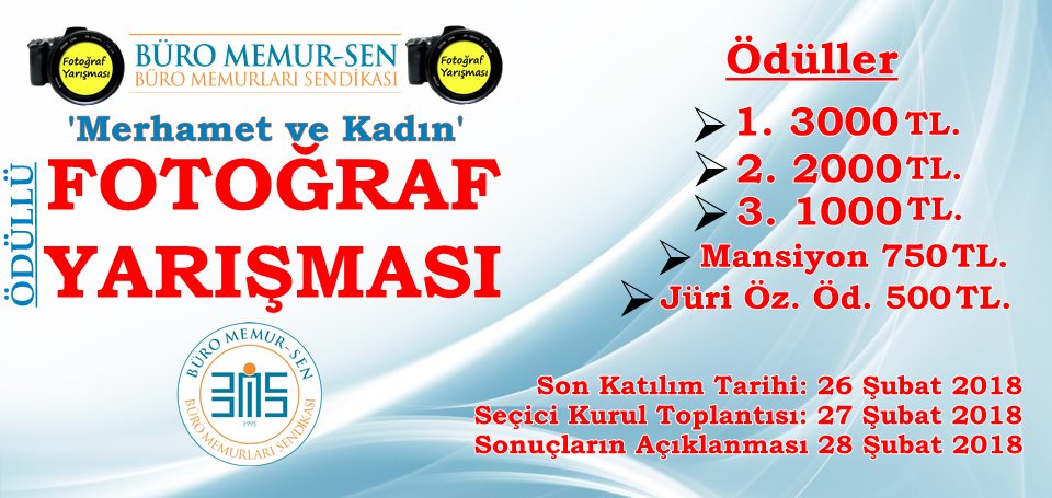 Memur-Sen Konfederasyonu’na bağlı Büro Memur-Sen, 8 Mart Dünya Kadınlar Günü nedeniyle ‘Ödüllü Fotoğraf Yarışması’ düzenliyor. Yarışma, kadınların hayattaki rolüne ve önemine dikkat çekmek amacıyla, ‘Merhamet ve Kadın’ temasıyla gerçekleştirilecek. Herkesin katılabileceği yarışmada birinciye 3 bin, ikinciye 2 bin, üçüncüye ise bin lira para ödülü verilecek. Mansiyon ödülü 750, jüri özel ödülü ise 500 lira olacak. Katılımcılar, yarışmayla ilgili şartnameye ‘buromemursen.org.tr’ adresinden ulaşabilecek. Yarışmaya katılımlar, 26 Şubat 2018 tarihinde son bulacak. Yarışmanın sonucu ise 28 Şubat 2018 tarihinde açıklanacak ve dereceye girenlere ödülleri düzenlenecek bir programla verilecek.