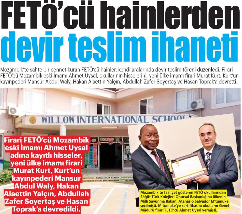 Türkiye’de topladıkları himmet-zimmet-rüşvet-vurgun paralarıyla doğu Afrika ülkesi Mozambik’e kaçıran Terör Örgütü FETÖ mensupları, geçtiğimiz ay ülkede yeni bir ‘okul’ daha açarak ‘okul’ sayısını 4’e çıkardı. Örgüt, bu kapsamda ‘Willow International School’ isimli sözde okullarının bağlı olduğu şirkette hisse devrine gitti. Afyon’da devam eden bir dava kapsamında ‘Dini inanç ve duygularının istismarı suretiyle dolandırıcılık, silahlı terör örgütü kurma ve yönetme’ suçlarından yargılanan firari FETÖ’cü Mozambik eski İmamı Ahmet Uysal adına kayıtlı hisseler, yeni ülke imamı firari Murat Kurt, Kurt’un kayınpederi Mansur Abdul Waly, Hakan Alaettin Yalçın, Abdullah Zafer Soyertaş ve Hasan Toprak’a devredildi.