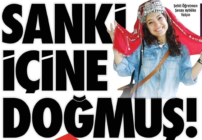 1 Ekim 2016’da ilçeye müzik öğretmeni olarak atanan 23 yaşındaki Şenay Aybüke Yalçın, daha bir yılını doldurmadan PKK teröristlerince şehit edildi. Kırmızı fularlı teröriste ağıt yakan hain zihniyetli tipler, Şenay öğretmenin teröre kurban gitmesini görmezden gelmeye devam ediyorlar.