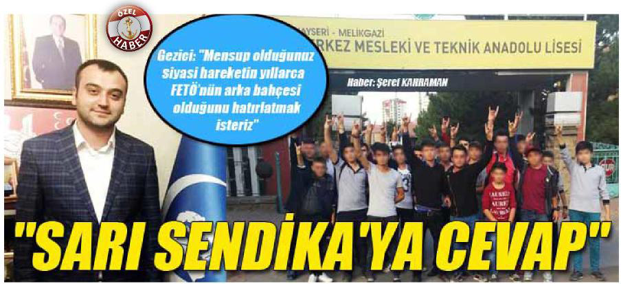 SARI SENDİKAYA CEVAP pf Haber: Şeref KAHRAMAN/ Kayseri Ülkü Ocakları Eğitim ve Kültür Vakfı Başkanı Aytaç Gezici, Eğitim Bir Sen Şube Başkanı Aydın Kalkan’ın ‘Okullar Ülkü Ocakları’nın Arka Bahçesi Olamaz’ sözlerine sert cevap verdi. Gezici, ‘Mensup olduğunuz siyasi hareketin yıllarca FETÖ’nün arka bahçesi olduğunu hatırlatmak isteriz’ dedi. Eğitim Bir Sen Şube Başkanı Aydın Kalkan’ın ‘Okullar Ülkü Ocakları’nın Arka Bahçesi Olamaz’ sözleri Ülkü Ocakları’nda tepki ile karşılandı.