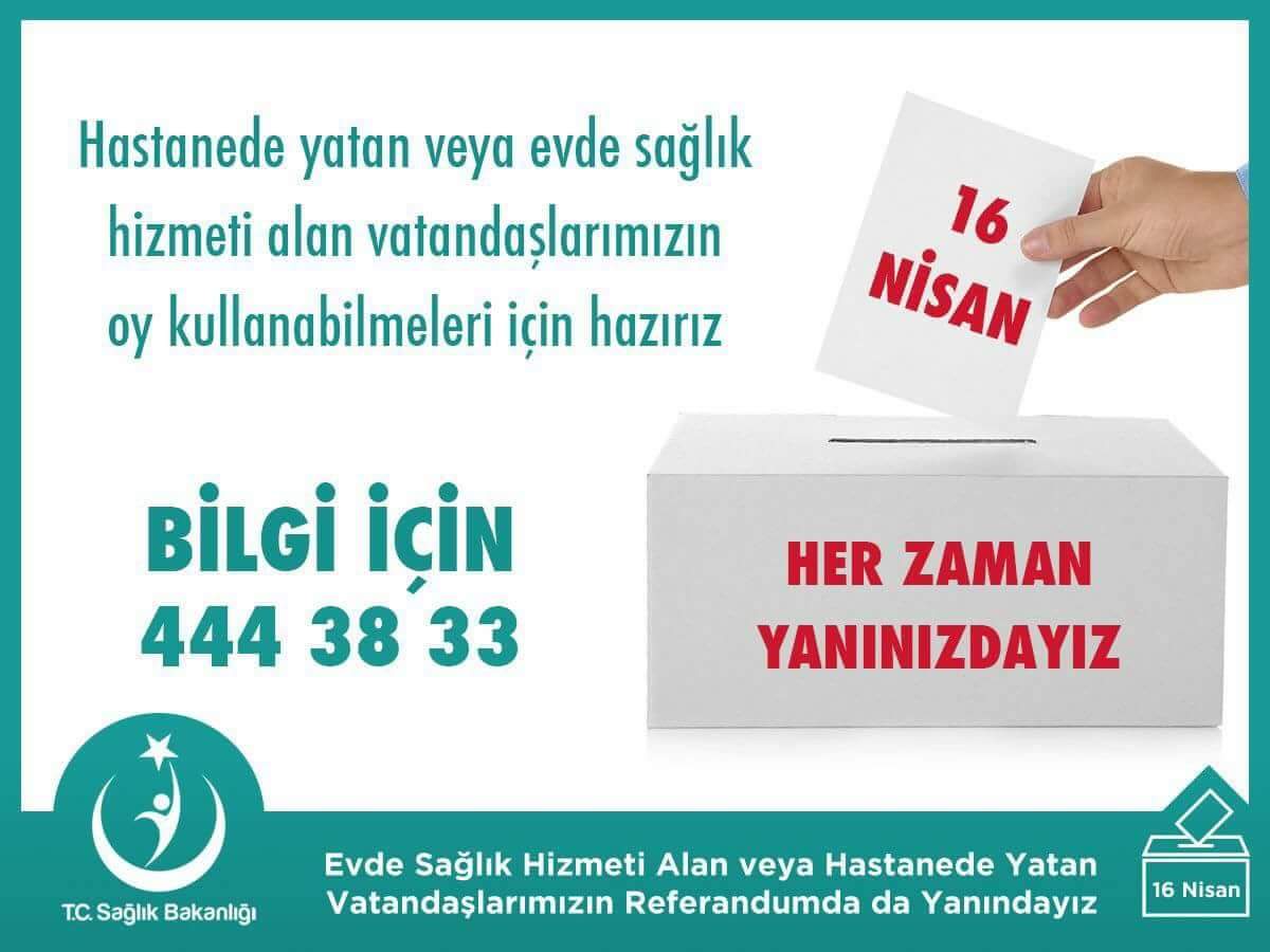 16 Nisan tarihinde hastahanede yatmakta olan veya evde bakım hizmetlerinden faydalanan hastalar 444 38 33 numaralı telefonu arayıp randevu almaları halinde sağlık Bakanlığı tarafından oy kullanmaları için sandığa götürülüp getirelecekler.