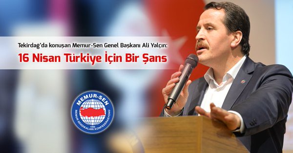Tekirdağ’da konuşan Memur-Sen Genel Başkanı Ali Yalçın, “Türkiye, dünya haritasının yeniden şekillendirildiği, yanı başının kan gölüne döndüğü ve her geçen gün yeni tuzakların kurulduğu bir zeminde, istikrarsızlıklarla, yavaş bir sistemle yürüyemez. Onun için 16 Nisan tüm tıkanıklıkları gidermek üzere Türkiye için bir şanstır” dedi.