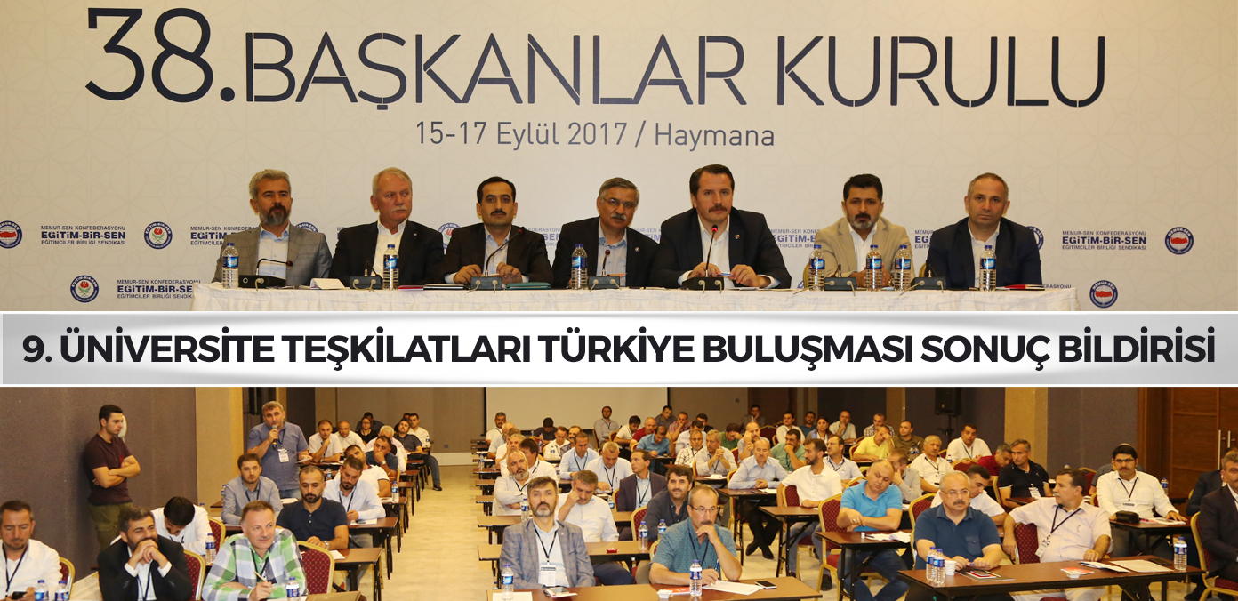 Eğitim-Bir-Sen 9. Üniversite Teşkilatları Türkiye Buluşması Haymana’da yapıldı. Sendikal çalışmaların görüşüldüğü, üniversite personelinin sorunlarının ele alındığı ve gündeme ilişkin değerlendirmelerin yapıldığı toplantının sonunda şu kararlar alındı: