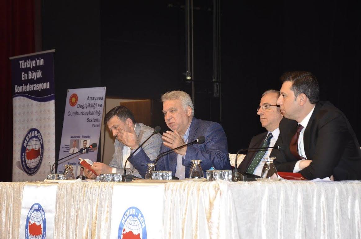 Memur-Sen İzmir İl Temsilciliği, ‘Anayasa Değişikliği ve Cumhurbaşkanlığı Sistemi’ konulu bir panel düzenledi. Konak Sabancı Kültür Merkezi’nde düzenlenen ve AK Parti İzmir Milletvekilleri Hamza Dağ, Kerem Ali Sürekli, Mahmut Atilla Kaya’nın konuşmacı olarak katıldığı panelin moderatörlüğünü AK Parti İzmir Milletvekili Hüseyin Kocabıyık yaptı. AK Partili hukukçu milletvekilleri, salonu dolduranlara sistem değişikliğinin gerekliliğini ve değişikliğin neler getireceğini detaylı olarak anlattı. Panele katılanlara Memur-Sen tarafından hazırlanan, ‘Sorularla Cumhurbaşkanlığı Hükümet Sistemi’ adlı kitap dağıtıldı.