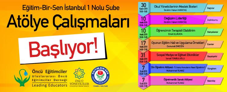 Planlanan atölye çalışmalarının ilki 30 Kasım 2016 Çarşamba günü Bağcılar ilçesinde 1 Nolu Şube Okul/Kurum Müdürlerimizin katılacağı “Okul Yöneticilerinin Meslek İlkeleri” konulu seminer ile başlayacak olup 7 Ocak 2016 tarihinde Bakırköy ilçemizde “Öğretmenlik Sanatı Atölyesi” adlı atölye çalışması ile sona erecektir.