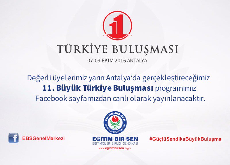 Eğitim Bir Sen 11.Türkiye Buluşması Antalya’da başlıyor. Buluşma Eğitim Bir Sen’in sosyal medya hesaplarından canlı yayınlanacak.