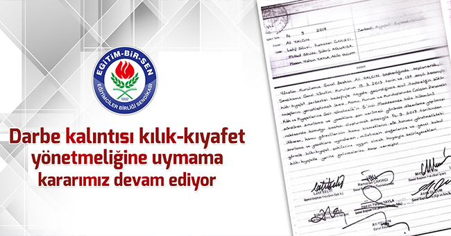 Eğitim-Bir-Sen Genel Yönetim Kurulu, 15 Mart 2013 tarihinde hayata geçirdiğimiz sivil itaatsizliğin bütün hedeflerini gerçekleştirmek üzere, Kamu Kurum ve Kuruluşlarında Çalışan Personelin Kılık ve Kıyafetlerine Dair Yönetmelik’in 5. maddesinde hâlâ hükmünü sürdüren sınırlama ve yasaklara son verilmesi yönünde düzenleme yapılmasını sağlamak için 14 Eylül 2017 tarihinden itibaren kamu görevlilerinin, kamu hizmetlerini söz konusu yönetmelikteki sınırlama ve yasaklara uymaksızın, toplumun değerlerine, genel kabul görmüş kılık-kıyafet şekillerine uygun olmak şartıyla belirleyecekleri kılık-kıyafetle yerine getirmelerine karar vermiştir.