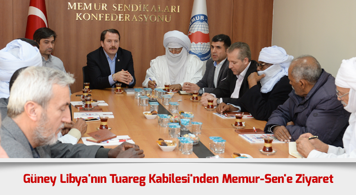 Memur-Sen Genel Başkanı Ali Yalçın ve Genel Başkan Yardımcıları Mehmet Emin Esen ile Levent Uslu, Güney Libya’nın en büyük kabilelerinden ‘Mavi Giyinenler’ olarak bilinen Tuareg Kabileleri Heyeti’ni konfederasyon genel merkezinde kabul etti.