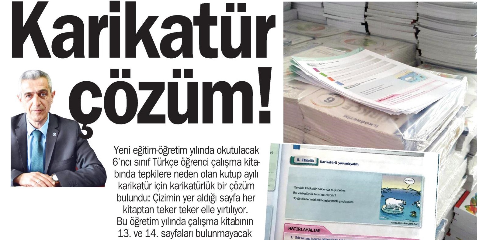 6’ncı sınıf Türkçe kitabında ‘çözüm’ bulundu Yeni eğitim-öğretim yılında okutulacak 6’ncı sınıf Türkçe öğrenci çalışma kitabındaki karikatür krizi, kitabın ilgili sayfasının yırtılarak kitaptan çıkarılmasıyla son buldu Uygulanan yöntem yine tepki çekerken, Türk Eğitim Sen İzmir 1 Nolu Şube Başkanı Merih Eyyup Demir, intihal yerine özgün çalışmalar yapılmasının bu yaşananların i önüne geçecek çözüm olacağını belirtti.