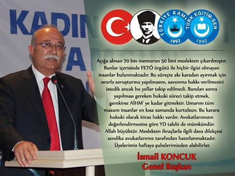 KONCUK sosyla medyadan yaptığı açıklamada 50 bin kişnii atıldığı KHK ile ilgili olarak Savunma hakkı vermeden yapılan meslekten ihraçların yanlış olduğunu, sorulturmalar sonucunda yapılaması gereken ihraçların aceleyle ypaıldığını ifade etti.