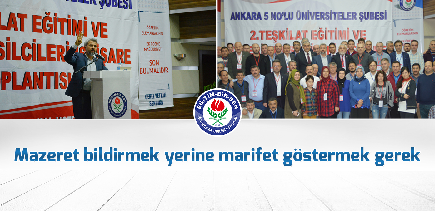 Eğitim-Bir-Sen Genel Başkan Yardımcısı Atilla Olçum, sorunlardan beslenen değil, çözümlerle güçlenen bir sendika olduklarını ifade ederek, “Biz sorunlu alanlara dikkat çekerek, çözüm önerileri sunarak, daha verimli olabilmeleri için çalışanların mağduriyetlerinin giderilmesi gerektiğini dile getirerek, sorunların çözümünün takipçisi olarak üzerimize düşeni yapıyoruz. Hiçbir zaman mazeretlere sığınmadık, sığınmıyoruz. Örnek işlere imza atıyoruz. Yetkililerden de, mazeret bildirmek yerine marifet göstermelerini, zamana yaymak, sümen altı etmek yerine sorunlara çözüm bulmalarını istiyoruz. Ayrımcılık yapanların, hukuk dışına çıkanların, keyfi uygulama yapanların karşısında olmaya devam edeceğiz” dedi.