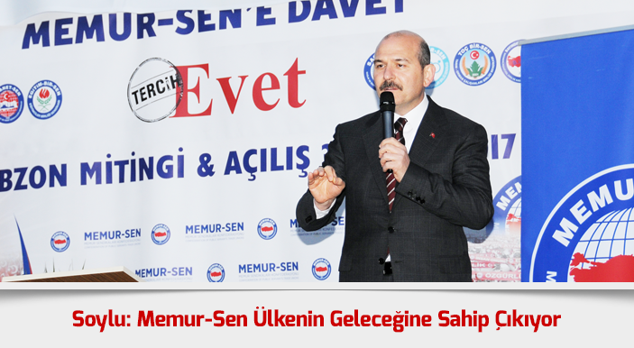 “Memur-Sen’e Davet, Tercih Evet” programı ile Memur-Sen Trabzon Hizmet Binasının açılışı İçişleri Bakanı Süleyman Soylu, Memur-Sen Genel Başkan Vekili ve Sağlık-Sen Genel Başkanı Metin Memiş ve Sağlık-Sen Genel Başkan Yardımcısı İdris Baykan’ın katılımı ile yapıldı. Açılışta konuşan Bakan Soylu, Memur-Sen’in sadece memurların hakkını korumadığını, ülkenin geleceğine sahip çıktığını söyledi. Memur-Sen Genel Başkan Vekili Memiş ise, vesayetin feshi, milli iradenin kalıcı hale gelmesi ve istikrar için çalıştıklarını söyledi.Soylu: Memur-Sen’e Teşekkür Ediyoruz