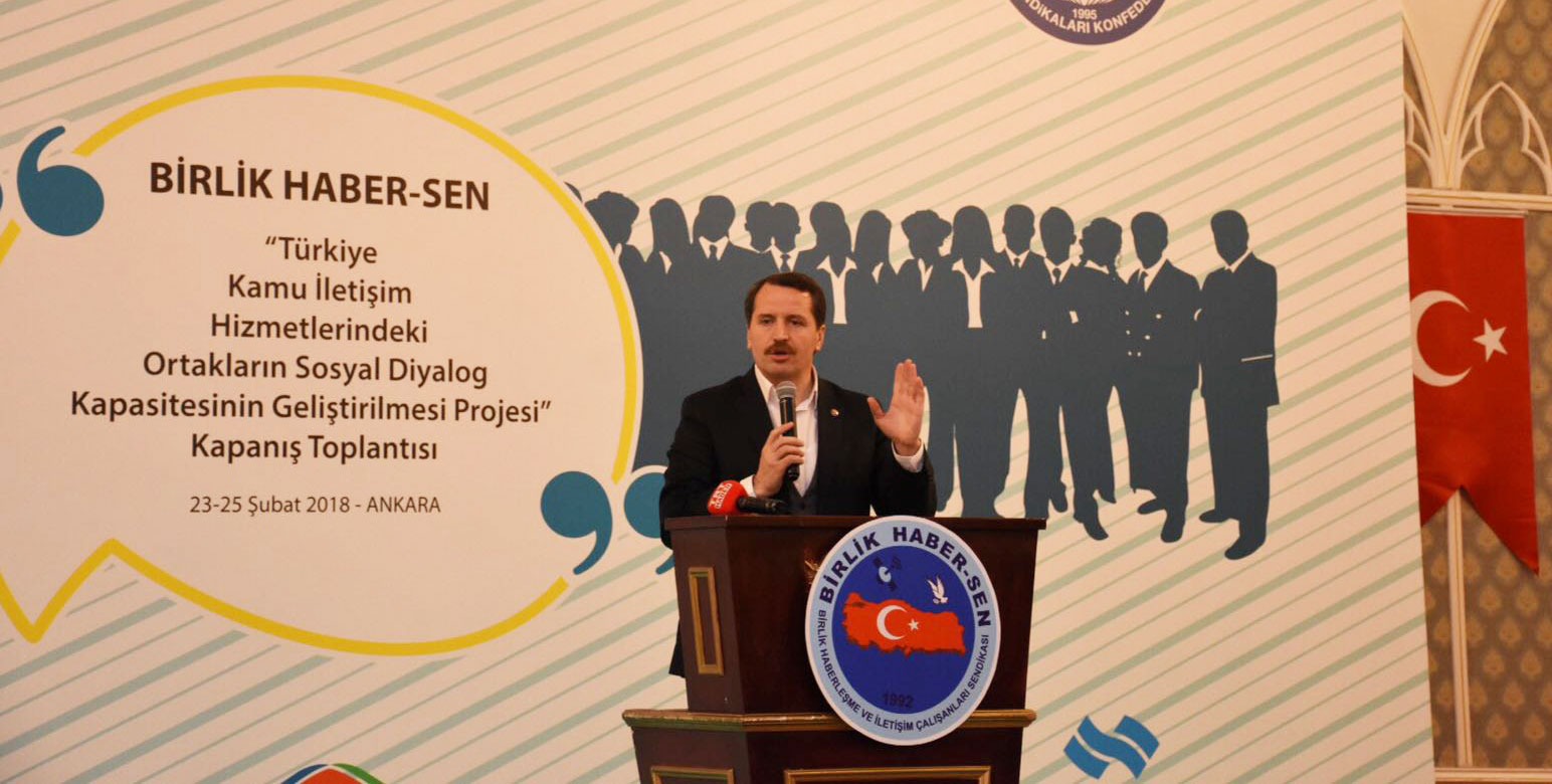 Memur-Sen Konfederasyonu’na bağlı Birlik Haber-Sen, Çalışma ve Sosyal Güvenlik Bakanlığı’nın nihai faydalanıcı, TRT Genel Müdürlüğü’nün paydaşlığı ile PTT’nin iştirakiyle başlattığı ve 9 aydır süren, ‘Türkiye Kamu İletişim Hizmetlerindeki Sosyal Ortakların Sosyal Diyalog Kapasitelerin Geliştirmesi Projesi”nin kapanışını Ankara’daki programla gerçekleştirdi. Programa, Memur-Sen Genel Başkanı Ali Yalçın’ın yanı sıra, Birlik Haber-Sen Genel Başkanı Ömer Budak, Memur-Sen’e bağlı sendikaların başkan ve yönetim kurulu üyeleri, Birlik Haber-Sen üyeleri, Çalışma Bakanlığı, TRT ve PTT bürokratları ve çok sayıda davetli katıldı.
