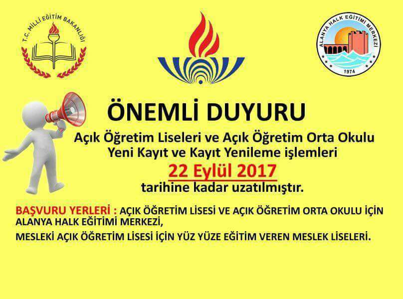 Açık Lise ve Ortaokul Kayıtları ve kayıt yenilemeleri 22 Eylül 2017 tarihine kadar uzatıldı.