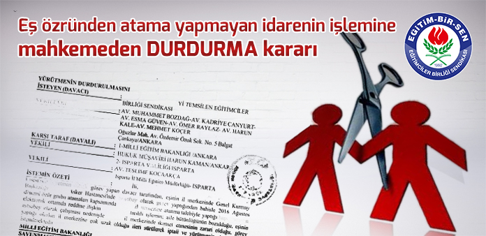 Isparta İdare Mahkemesi, Isparta’nın Senirkent İlçesi’nde öğretmen olarak görev yapan Eğitim-Bir-Sen üyesinin, eşinin il merkezinde bulunan asker hastanesinde astsubay olarak görev yaptığından bahisle 2016 Ağustos dönemi özür grubu atamaları kapsamında il merkezine atanma istemiyle yaptığı başvurunun puan yetersizliği nedeniyle elektronik ortamda reddi yönünde tesis edilen işlemin, hukuka aykırı olduğu gerekçesiyle, yürütülmesini durdurdu.