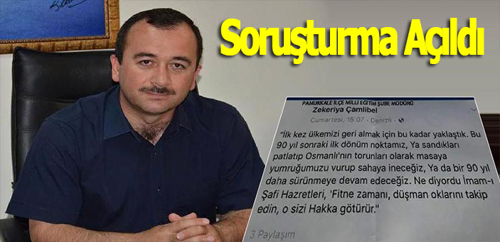 Pamukkale İlçe Milli Eğitim Şube Müdürü Zekeriya Çamlıbel’in bir süre önce Facebook hesabından yaptığı paylaşımda ‘İlk kez ülkemizi geri almak için bu kadar yaklaştık. Bu 90 yıl sonraki ilk dönüm noktamız. Ya sandıkları patlatıp Osmanlı’nın torunları olarak masaya yumruğumuzu vurup sahaya ineceğiz, ya da bir 90 yıl daha sürünmeye devam edeceğiz. Ne diyordu îmam-ı Safi Hazretleri; Fitne zamanı, düşman oklanm takip edin, o sizi Hakka götürür’ ifadeleri yer aldı.